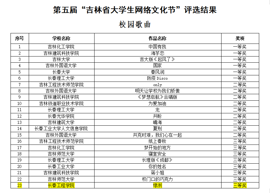 ⻢克思主义学院刘春玲老师的作品《与生书-致机制1843班同学的一封信》获高校网络教育优秀作品网络文章类一等奖;水利与环境工程学院给水1842班郭浩哲的作品《⻘春有“梦”》获吉林省大学生网络文化节网文类二等奖;计算机技术与工程学院软件1841班陈黔、计算1842班张家源、电商1932班刘天全、物联1841班雷镕旗的作品《绿洲》获吉林省大学生网络文化节校园歌曲类三等奖。