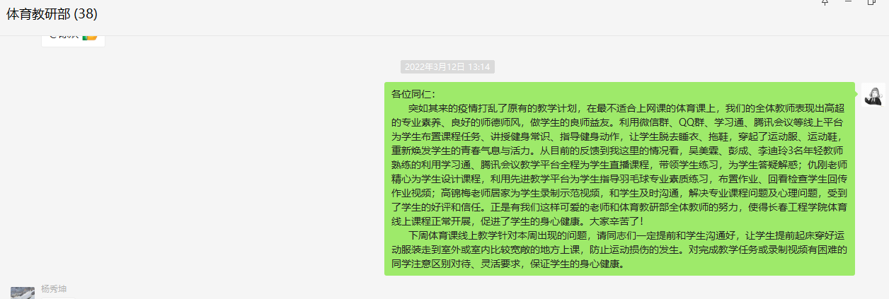 体育不仅要“野蛮其体魄”,还要“强健其精神”。教师们在授课过程中融入了部分体育思政元素。他们根据课程内容,为学生发送“中国女排”“中国女足”“姚明在NBA”等比赛视频,向学生展示宣传我国优秀运动员顽强拼搏、团结一致、吃苦耐劳、共同奋斗的体育精神,让学生在“全民抗疫”的困难时期感受体育精神,保持乐观心态,团结一致、共渡难关。