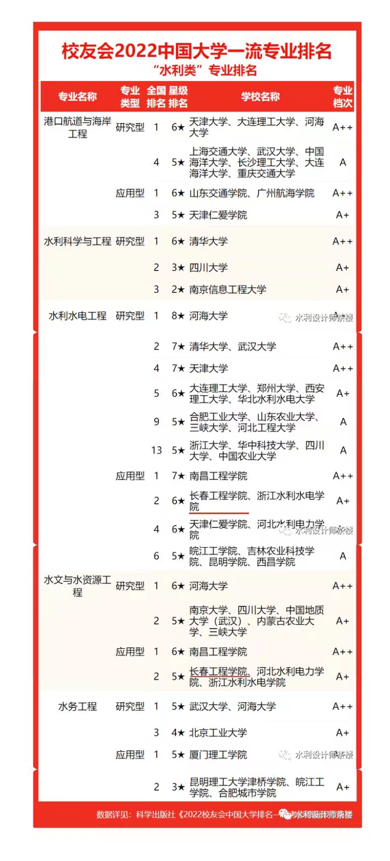 近日,由全国第三方大学评价机构艾瑞深校友会网(Cuaa.Net)撰写完成、科学出版社出版发行的《2022校友会中国大学排名—高考志愿填报指南》最新发布的校友会2022中国大学“水利水电工程专业排名(应用型)”和“水文与水资源工程专业排名(应用型)”中,我校均名列前茅。