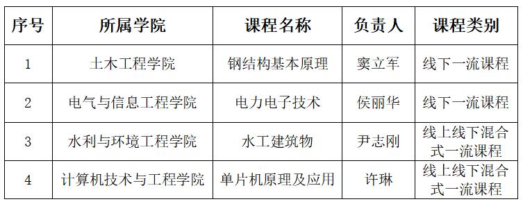 近日,教育部公布了第二批国家级一流本科课程认定结果,我校共有4门课程被认定为国家级一流本科课程,其中线下一流课程2门,分别为《钢结构基本原理》《电力电子技术》;线上线下混合式一流课程2门,分别为《水工建筑物》《单片机原理及应用》。本次获批国家级一流本科课程实现了开云官方app下载站_开云(中国)一流课程建设的历史性突破,体现了开云官方app下载站_开云(中国)在课程建设方面取得的新成效。