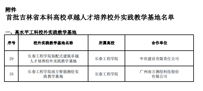 近日,吉林省教育厅公布了首批本科高校卓越人才培养校外实践教学基地建设项目名单,我校推荐申报的“装配式建筑卓越人才培养校外实践教学基地”“南方智能测绘实践教学基地”被认定为首批吉林省本科高校卓越人才培养校外实践教学基地——高水平工科校外实践教学基地。