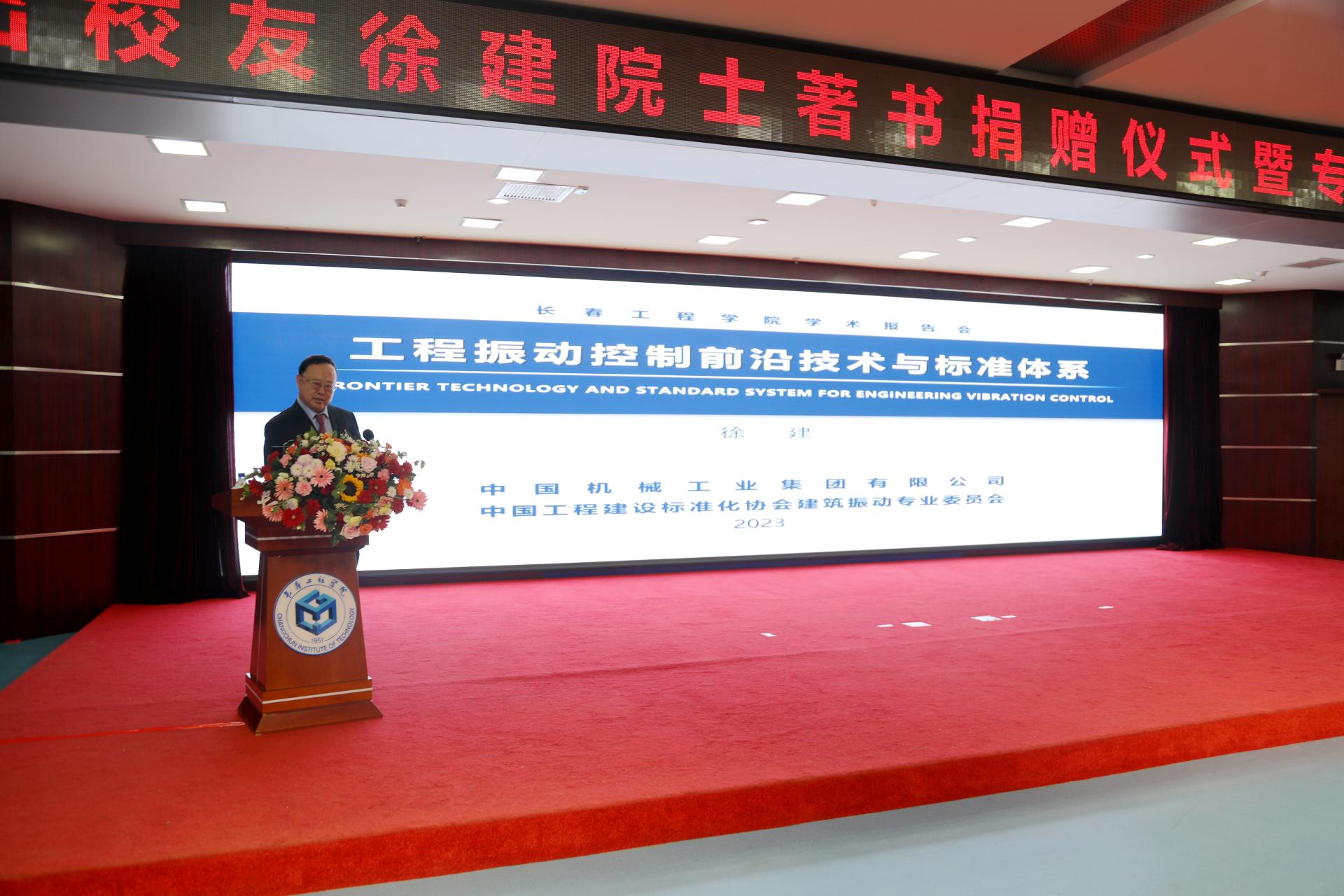 捐赠仪式结束后,徐建院士分享了精彩的学术报告,他从振动的性质、工程振动产生的危害、振动控制的重要作用、振动控制的复杂性等方面介绍了振动控制的意义;从技术研究背景、精密加工制造、精密光学观测、空间环境模拟、新能源工程、大科学装置、多源振动控制和技术发展趋势等八个方面介绍了工程振动控制前沿技术。他还介绍了他编制的工程振动控制有关的国家标准。报告中既有专业技术理论的剖析,又有工程案例的展示,徐建院士激情澎湃的讲解和深入浅出的解析,让参会师生沉浸在浓厚的学术氛围中,纷纷表示受益匪浅。