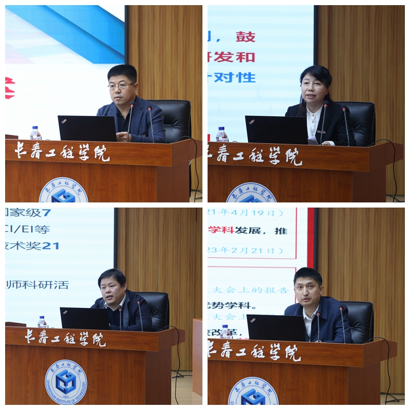 发展规划处处长李长雨、教务处处长王文华、科学研究处处长张以晨、学科建设办公室主任胡南分别围绕《应用型大学建设行动方案》解读、产教融合、科创融汇、学科建设等内容进行交流报告。