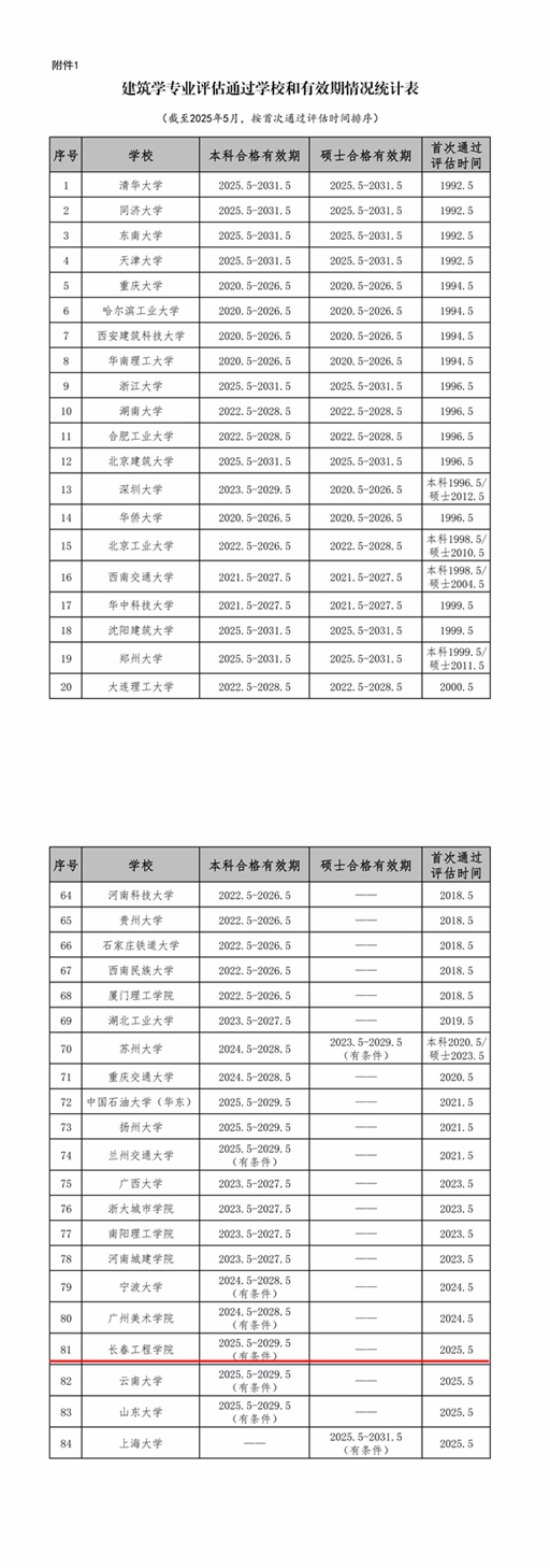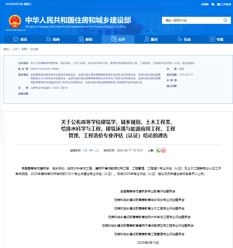 近日,住房和城乡建设部发布《关于公布高等开云官方app下载站_开云(中国)建筑学、城乡规划、土木工程类、给排水科学与工程、建筑环境与能源应用工程、工程管理、工程造价专业评估(认证)结论的通告》(土建专业评估通告〔2025〕第1号),我校建筑学专业和工程造价专业通过评估(认证),合格有效期均为4年,自2025年5月起至2029年5月止。