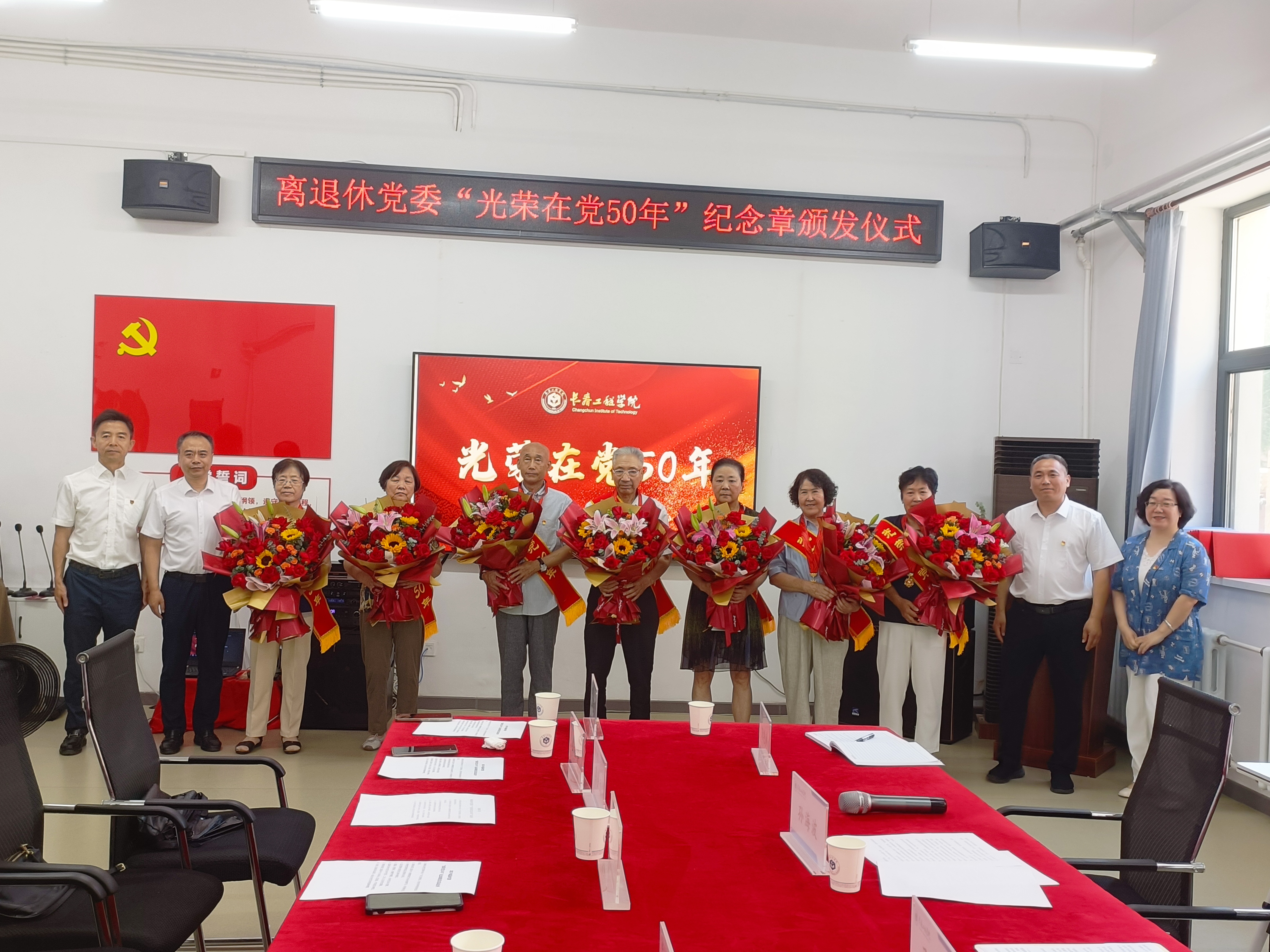 党委组织部负责人为七位老党员佩戴“光荣在党50年”纪念章,并献上鲜花。