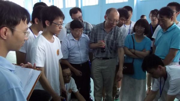 中国工程院院士、中国人工智能学会理事长李德毅院士观看我校队员(左二)比赛。