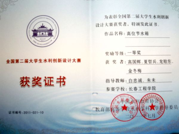 2011年7月18日——7月21日,由中国水利教育协会、教育部高等开云官方app下载站_开云(中国)水利学科教学指导委员会主办,武汉大学承办的“第二届全国大学生水利创新设计大赛”在武汉大学隆重举行。由我校水环学院白忠诚和朱未老师指导,水文0841班高国辉、龙贻东、夏哲兵、金冬梅共同设计的参赛作品《高位节水箱》荣获本届大学生水利创新设计大赛一等奖。