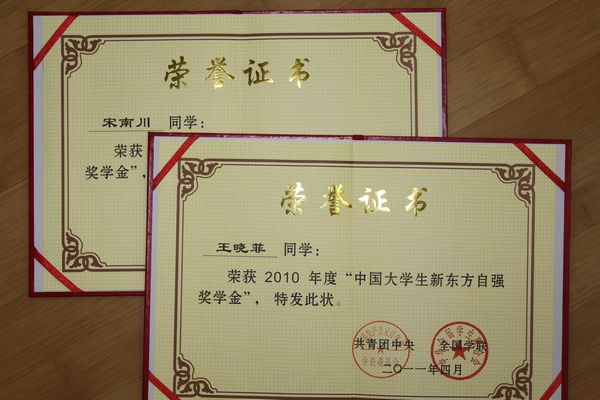 近日,2010年度寻访“中国大学生自强之星”活动评选结果揭晓,我校理学院宋南川同学、外语学院王晓菲同学荣获2010年度寻访“中国大学生自强之星”提名奖,并获得“中国大学生新东方自强奖学金”2000元。