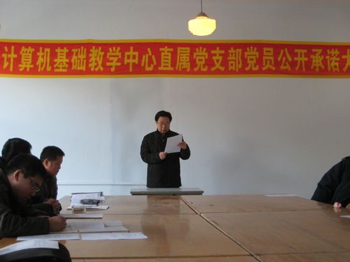 3月16日下午,计算机基础教学中心会议室布置的整洁干净,全体教工整齐地围坐在会议桌周围,在这里正在举行“创先争优活动党员公开承诺大会”,党支部书记吕军文宣布会议开始后,中心主任许建仁同志首先到台前发言,面向全体教工作出了四点郑重承诺。他的发言内容实际,话语质朴,态度坚决,讲话过后全体教工报以热烈的掌声,给予了充分的肯定和赞许。接着,支委、中心副主任于大伟,办公室主任郑义等全体党员依次在会上作出了承诺。每位党员发言过后,全体与会教工都用热烈的掌声给予拥护和支持。于大伟同志还代表党支部向全体教工做出了承诺。吕军文在结束个人承诺发言后,做了简短的总结,他强调每位党员要信守自己的诺言,努力实践自己的承诺,在工作中要充分发挥党员的先锋模范作用,同时,欢迎广大教工的监督,不断推进我单位创先争优活动的深入开展。