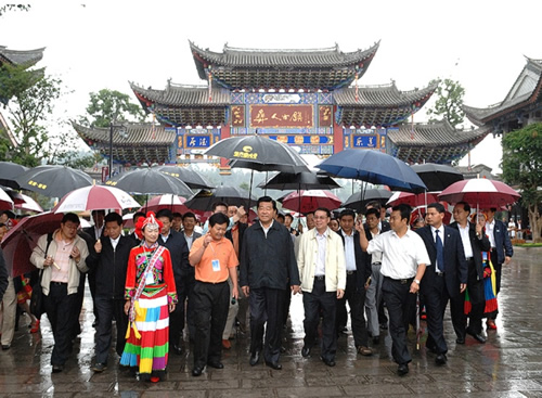 全国政协主席贾庆林到李陈校友开发的彝人古镇视察(贾主席右手侧第一人为我校校友李陈)