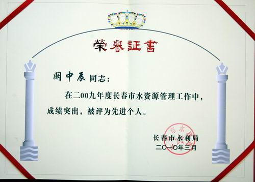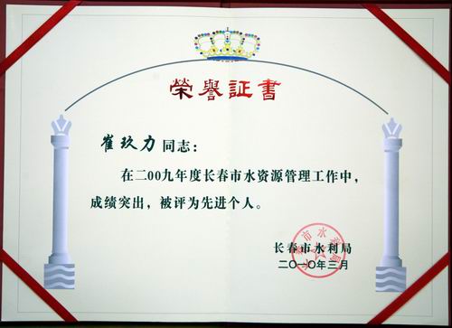 在迎接第十八届“世界水日”、第二十三届“中国水周”之际,我校被长春市水利局评为2009年度长春市水资源管理工作先进单位。此外,物业管理中心崔玖力、阚中辰被评为先进个人。